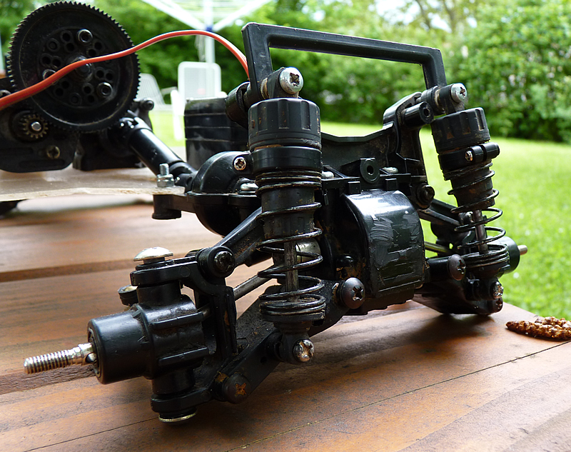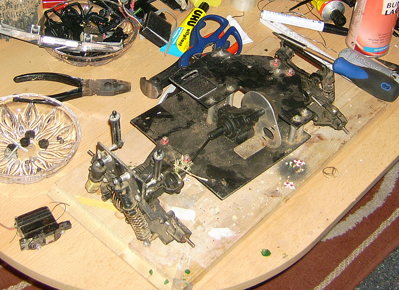 Sämtliche Teile wurden komplett zerlegt, gesäubert und wieder zusammengesetzt. Das Chadori-Getriebe wich dem aus meinem Scorpion, was etwas kleiner ist und vor allem einen Starren Durchtrieb hat. Das Buggy-Diff ist mir immer wieder aufgegangen.