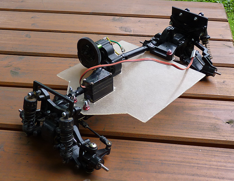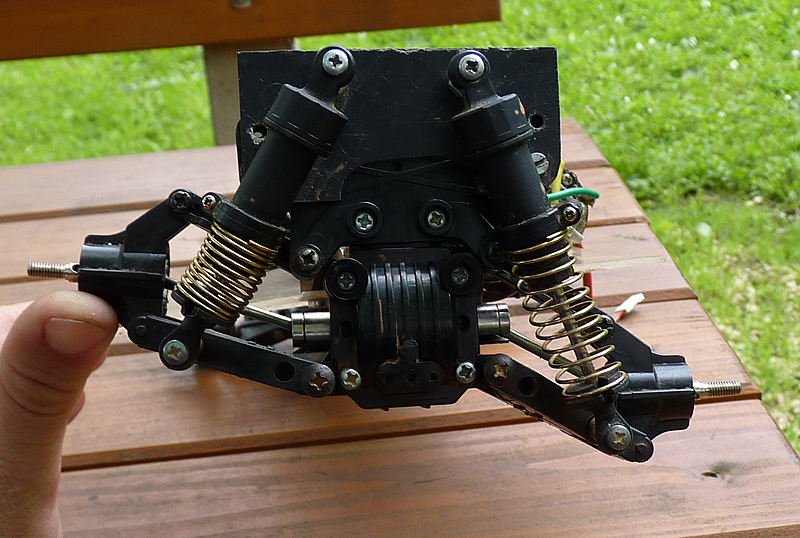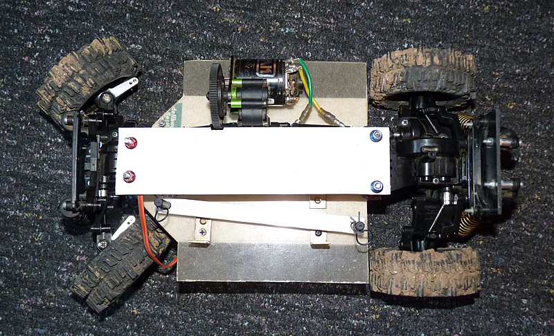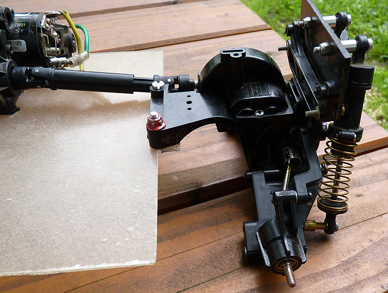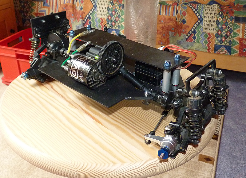 Warum das Mittelgetriebe wurde ja schon diskutiert- der Motor wandert weg von seiner unheimlich störenden Position unter der Hinterachse nach oben auf die Chassisplatte. Die Motorhalterung kann dem Dremel zum Fraß vorgeworfen werden.