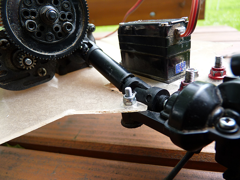 Für die Antriebswellen habe ich mich bei Traxxas bedient- sind zwar ziemlich fett, aber der Dremel schafft abhilfe. Die Wellen lassen sich bequem auf die orginalen Diffausgänge stecken und verstiften. Diese sind ein paar mm gekürzt, um die Welle weiter drüberschieben zu können.