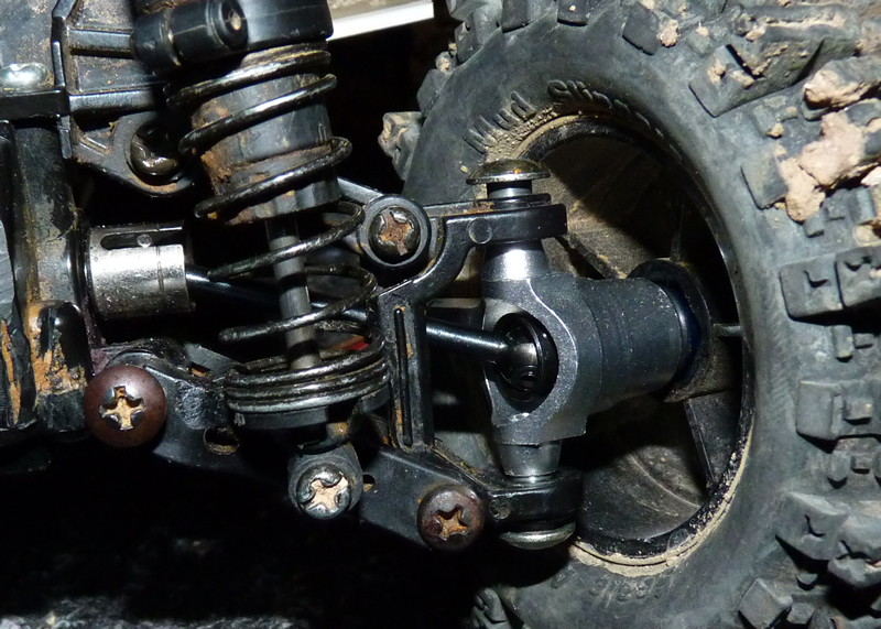 Auch sehr wichtig: die hinteren Achsschenkel drehen. Dadurch wandern die Reifen weiter nach vorne, und man sitzt nicht mehr mit den Resten der Motorhalterung und erst später mit dem Diff auf.